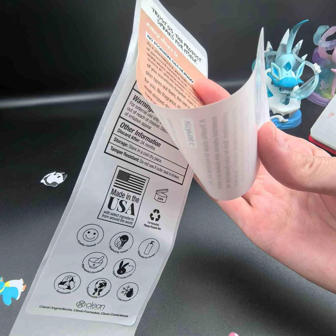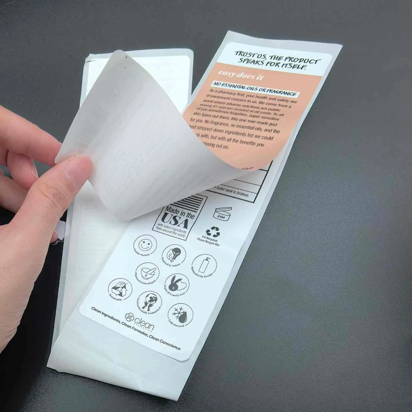 Décollez et lisez les étiquettes :Le type le plus basique, également appelé multicouche pour les étiquettes cosmétiques. La couche supérieure est facile à décoller et la couche interne contient des informations étendues. Il est souvent utilisé pour les masques faciaux, les sérums et autres produits en petit emballage.