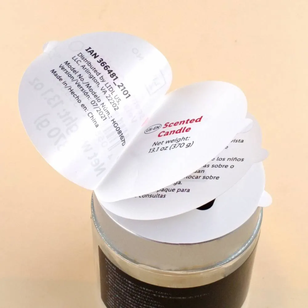 Étiquettes de pliage à plusieurs couches: Ils viennent dans des étiquettes de pliage de type "accordéon" de type Spring, ainsi que des étiquettes d'instructions multicouches. En dépliant la première couche de l'étiquette, vous pouvez retirer les multiples couches en dessous. Dans certains cas, en dépliant la première couche, vous pouvez l'ouvrir aux deux extrémités, les plier ensemble, puis ils reprendront l'apparence d'une seule couche.