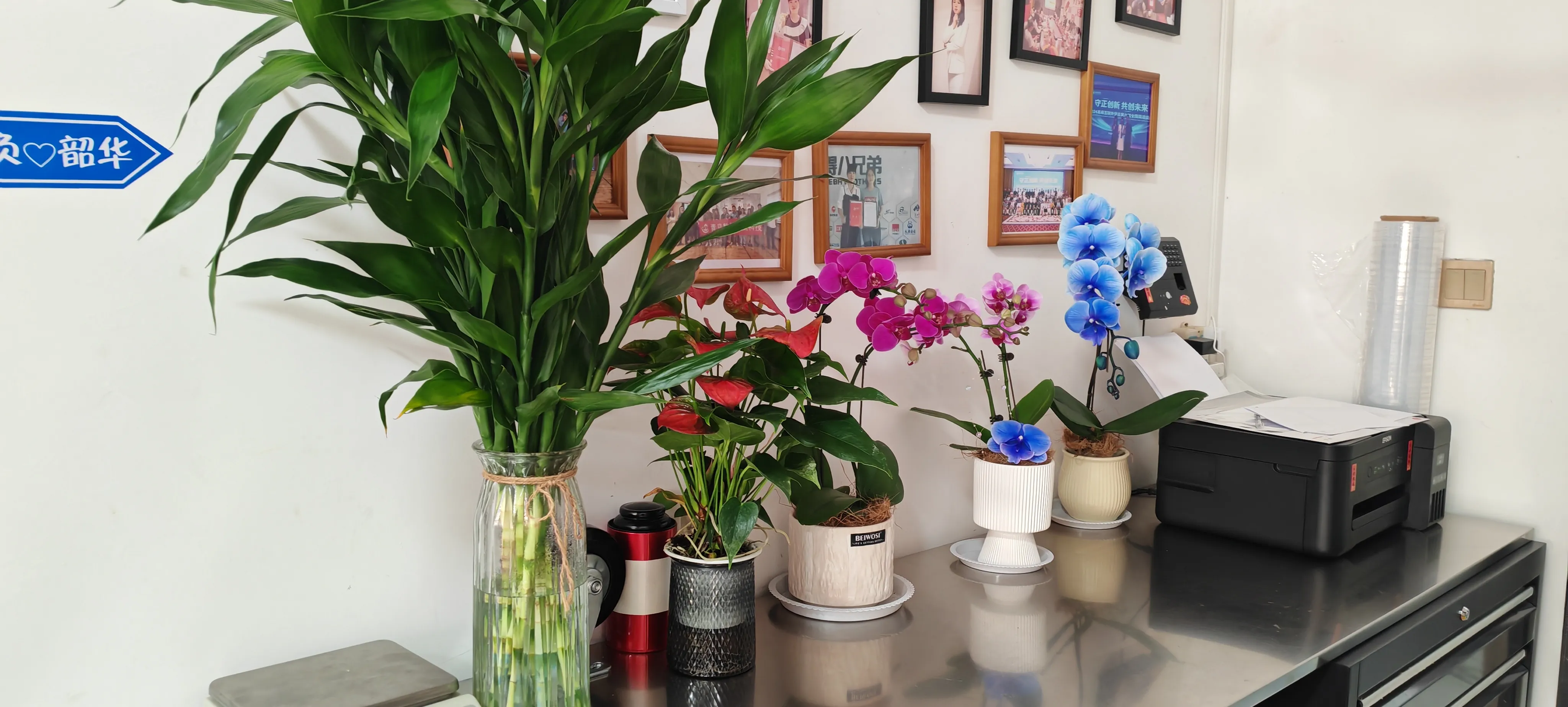 Entrez dansPacks JOJObureau. Il y a trois pots de phalaenopsis de part et d’autre du comptoir d’accueil. Leurs feuilles sont étalées et droites, tout comme des papillons qui vont s'envoler. Ils ajoutent une touche d'élégance et de grâce à l'entreprise. Le dracaena sanderiana vert chasse la monotonie des bureaux. De nombreux salariés sont attirés par les changements dès leur arrivée dans l’entreprise. Ils s'arrêtent pour profiter et prendre des photos avec leur téléphone portable.
