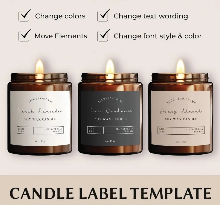 Aluminium:Offre une excellente durabilité et un aspect métallique élégant. Il est étanche et résistant à la chaleur, ce qui le rend adapté aux bougies dans des environnements à haute température. La surface réfléchissante du matériau améliore la visibilité de la marque mais peut être plus lourde que d’autres options.