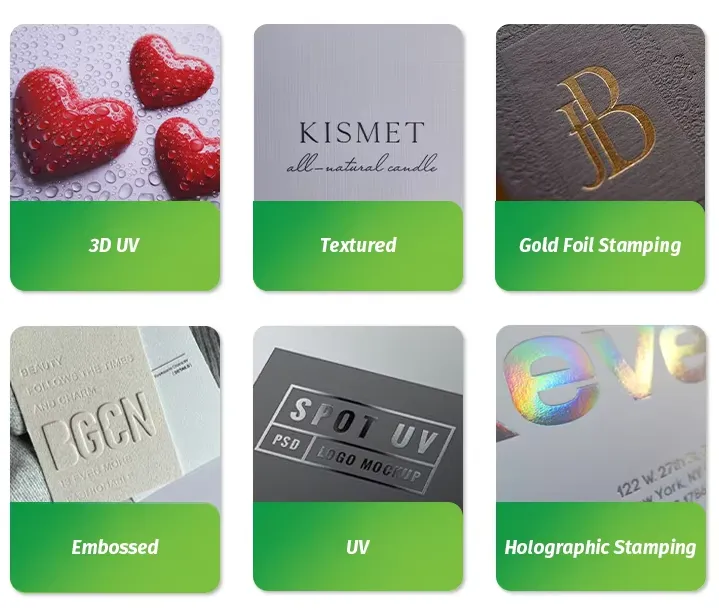 Gaufrage : crée des motifs ou du texte en relief en trois dimensions sur les étiquettes des bougies parfumées. Il ajoute de la texture et un élément tactile, rendant les étiquettes des bougies parfumées plus attrayantes au toucher. Le gaufrage fonctionne bien avec des logos ou des motifs décoratifs, améliorant ainsi l'aspect haut de gamme.