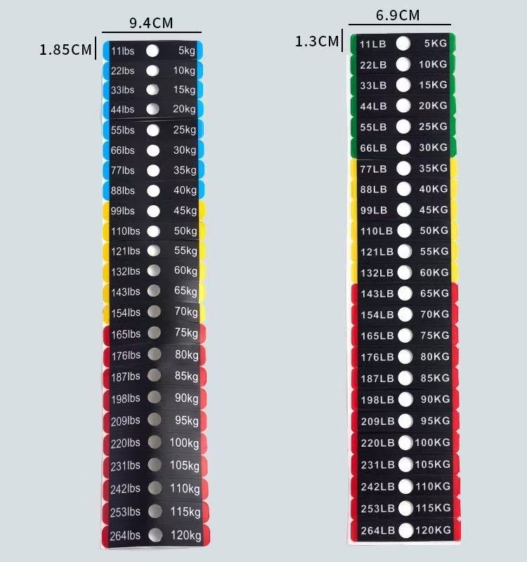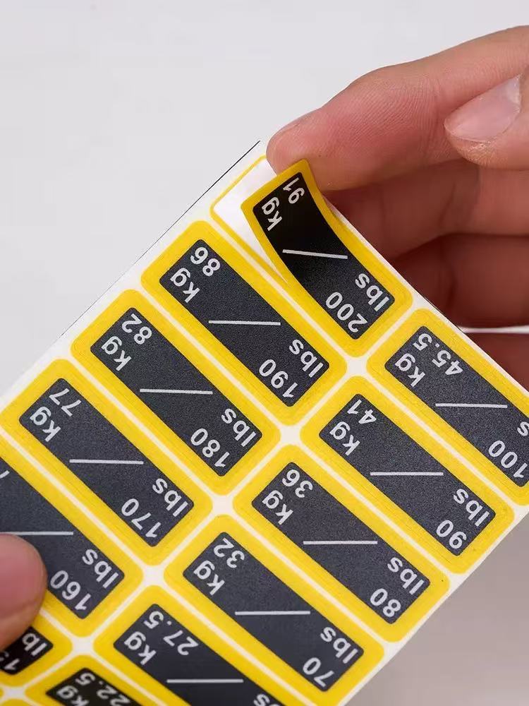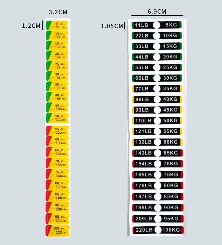 Ces autocollants de poids pour blocs de poids d'équipement de fitness sont un type d'autocollants d'identification spécialement conçus pour étiqueter le poids des équipements de fitness. Ils sont généralement fabriqués en PVC et vous pouvez vous référer au tableau des paramètres du produit pour les dimensions spécifiques. Les valeurs de poids sont clairement indiquées sur les autocollants, permettant aux utilisateurs d'identifier et de sélectionner rapidement le poids d'entraînement approprié.