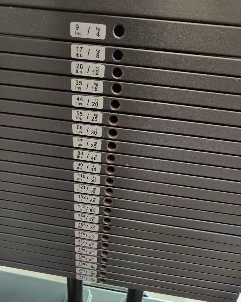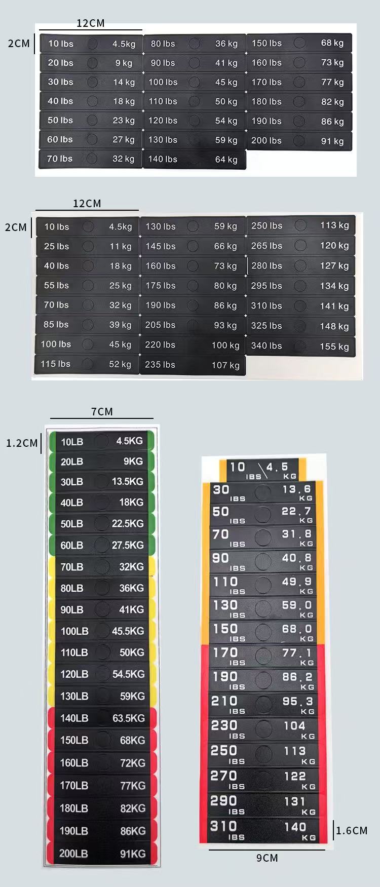 Chaque autocollant indique clairement les valeurs de poids, permettant aux utilisateurs d'identifier et de sélectionner rapidement les blocs de poids adaptés à leur intensité d'entraînement et d'éviter des pesées fréquentes pendant les entraînements.